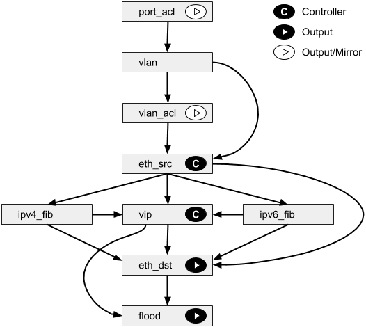 This summarizes the global FAUCET pipeline; however, certain tables may be omitted if the functionality is not required. For example, if routing is not configured, neither FIB table nor the VIP table will be provisioned.